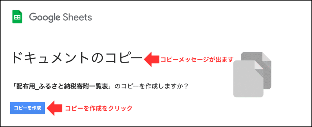 ①コピー先のリンクをクリックすると、「ドキュメントのコピー」のメッセージが表示されます。